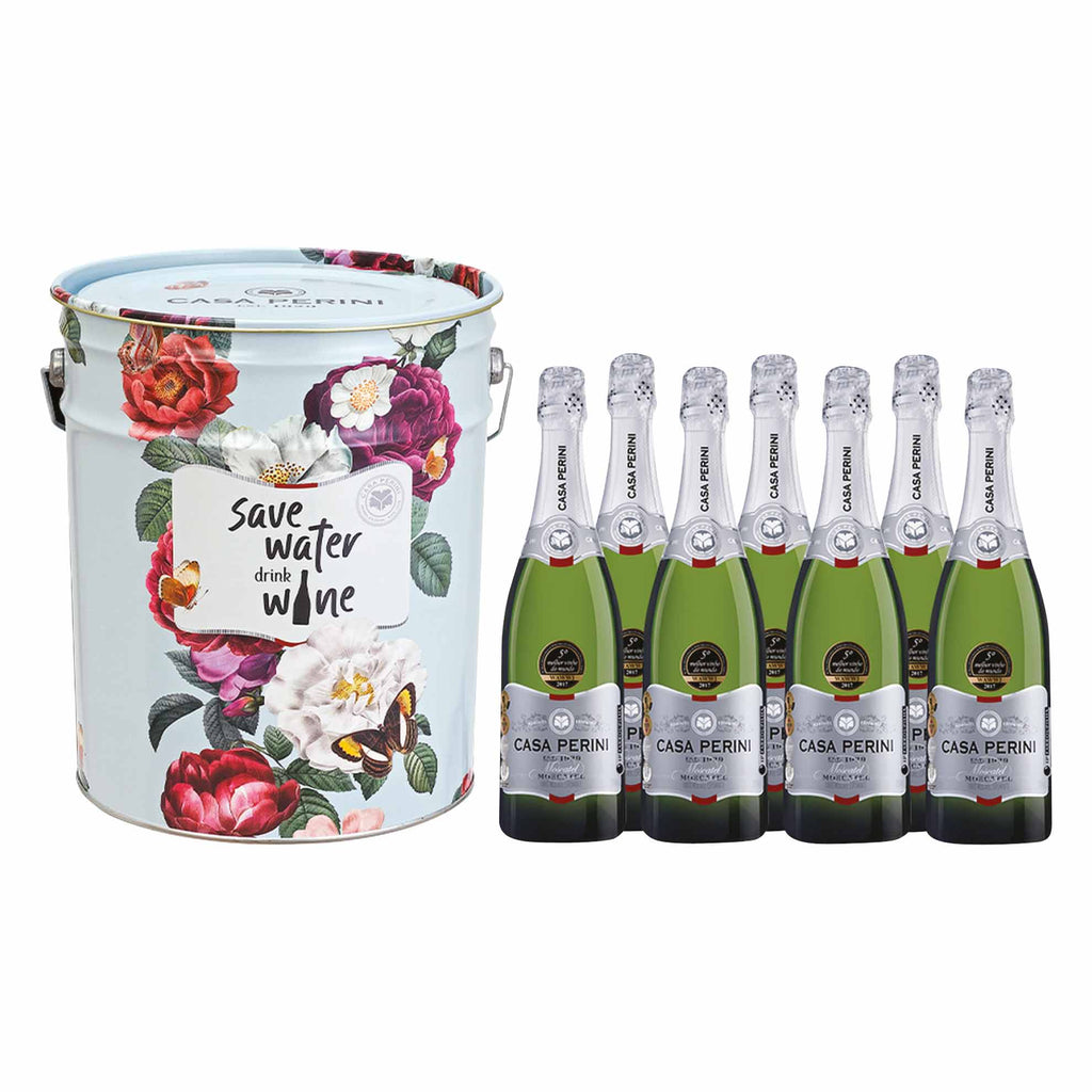 O Balde Espumante Casa Perini Moscatel 2024 é perfeito para os apreciadores de espumantes mais doces e aromáticos. Este conjunto exclusivo inclui 7 garrafas de 750ml do nosso espumante Moscatel, apresentadas em um balde decorativo com design floral exclusivo e a frase divertida "Save Water, Drink Wine".